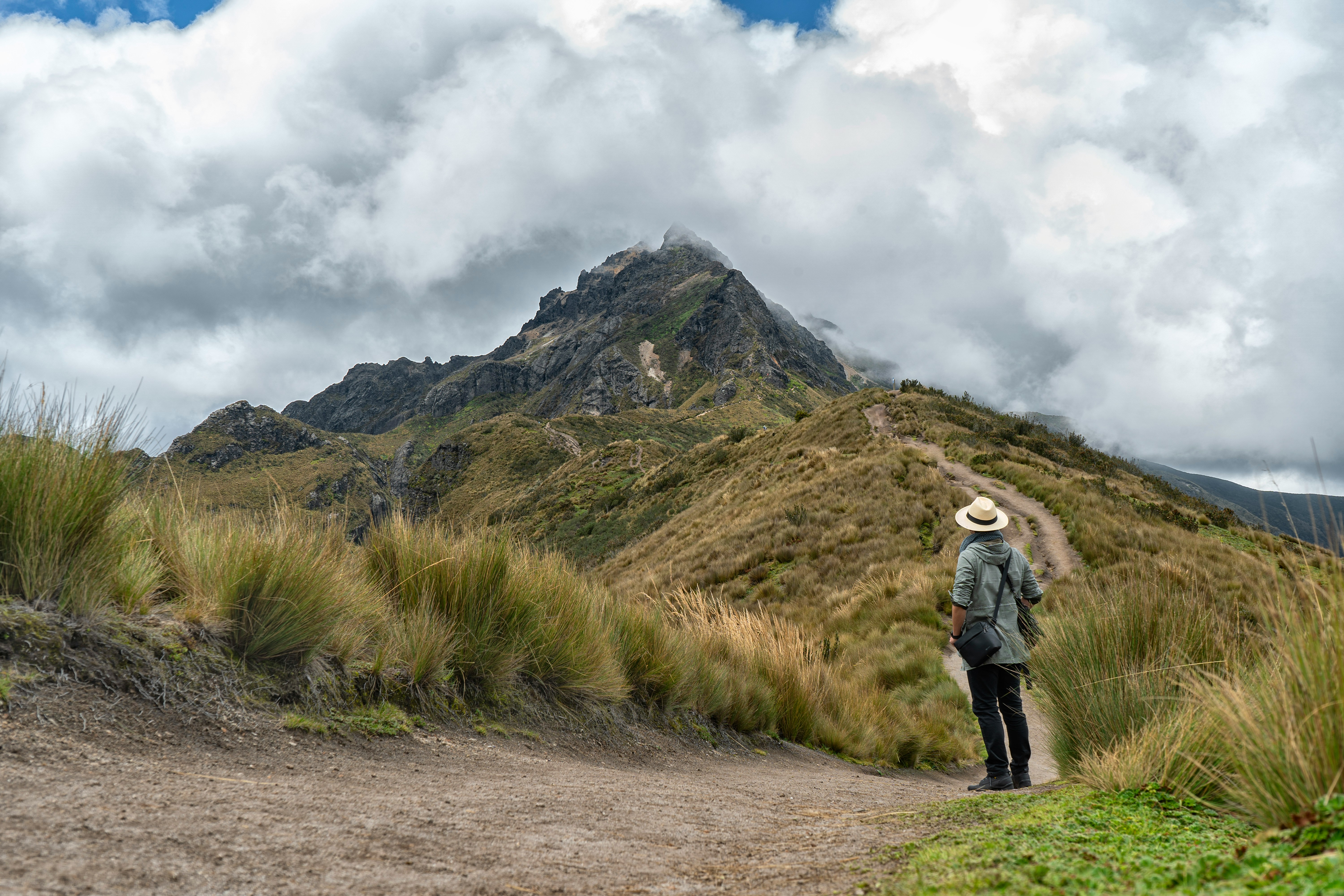 Persona caminando en sendero de tierra atravesando vegetación de páramo andino con volcán o pico montañoso al fondo bajo cielo nublado. Escena típica de ecosistema de altitud en los Andes ecuatorianos.