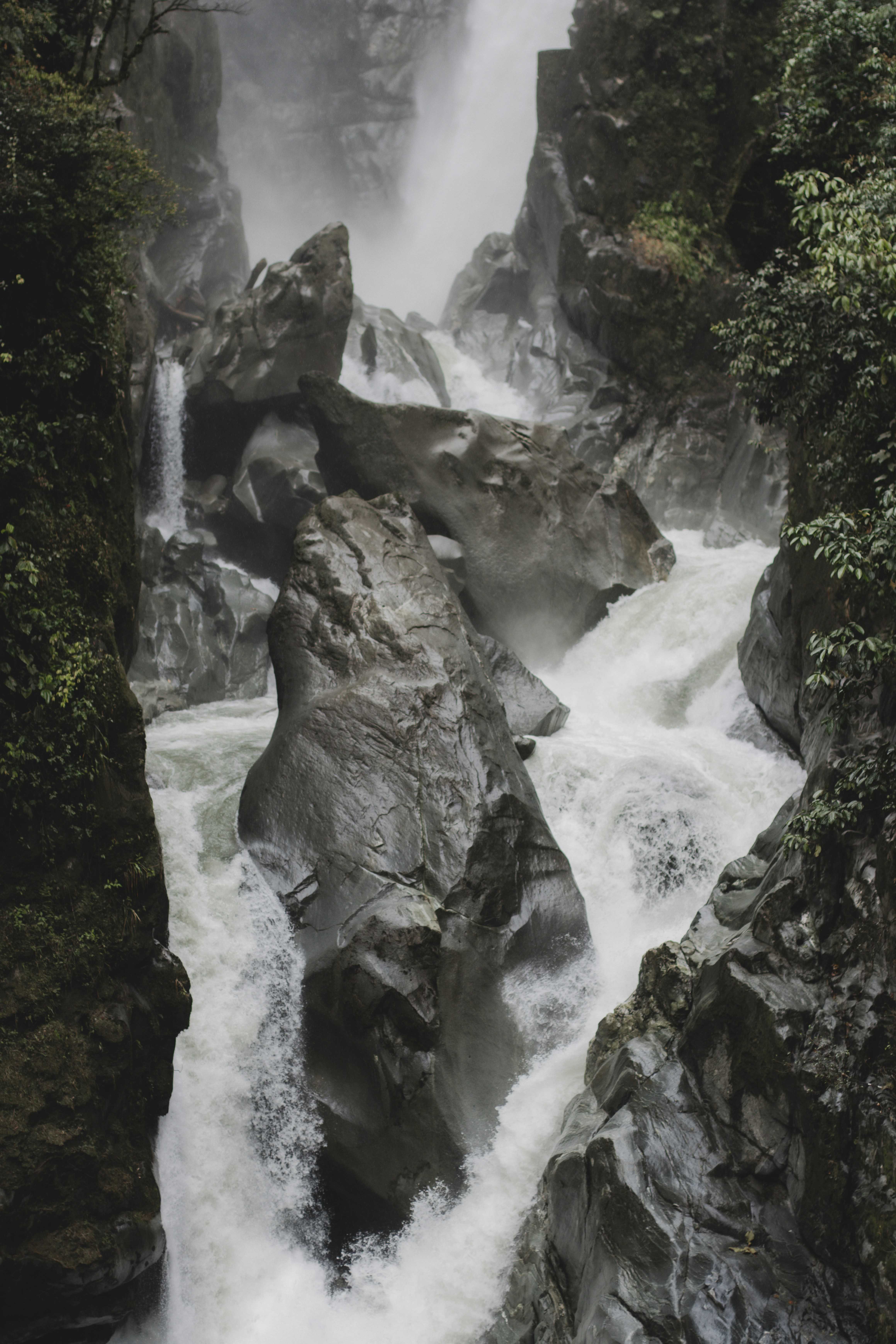 Cascada espectacular fluyendo entre paredes rocosas verticales cubiertas de vegetación. La caída de agua crea una cortina blanca que contrasta con la roca gris y la vegetación verde. Composición típica de los cañones del oriente ecuatoriano, específicamente de la zona de Baños de Agua Santa.