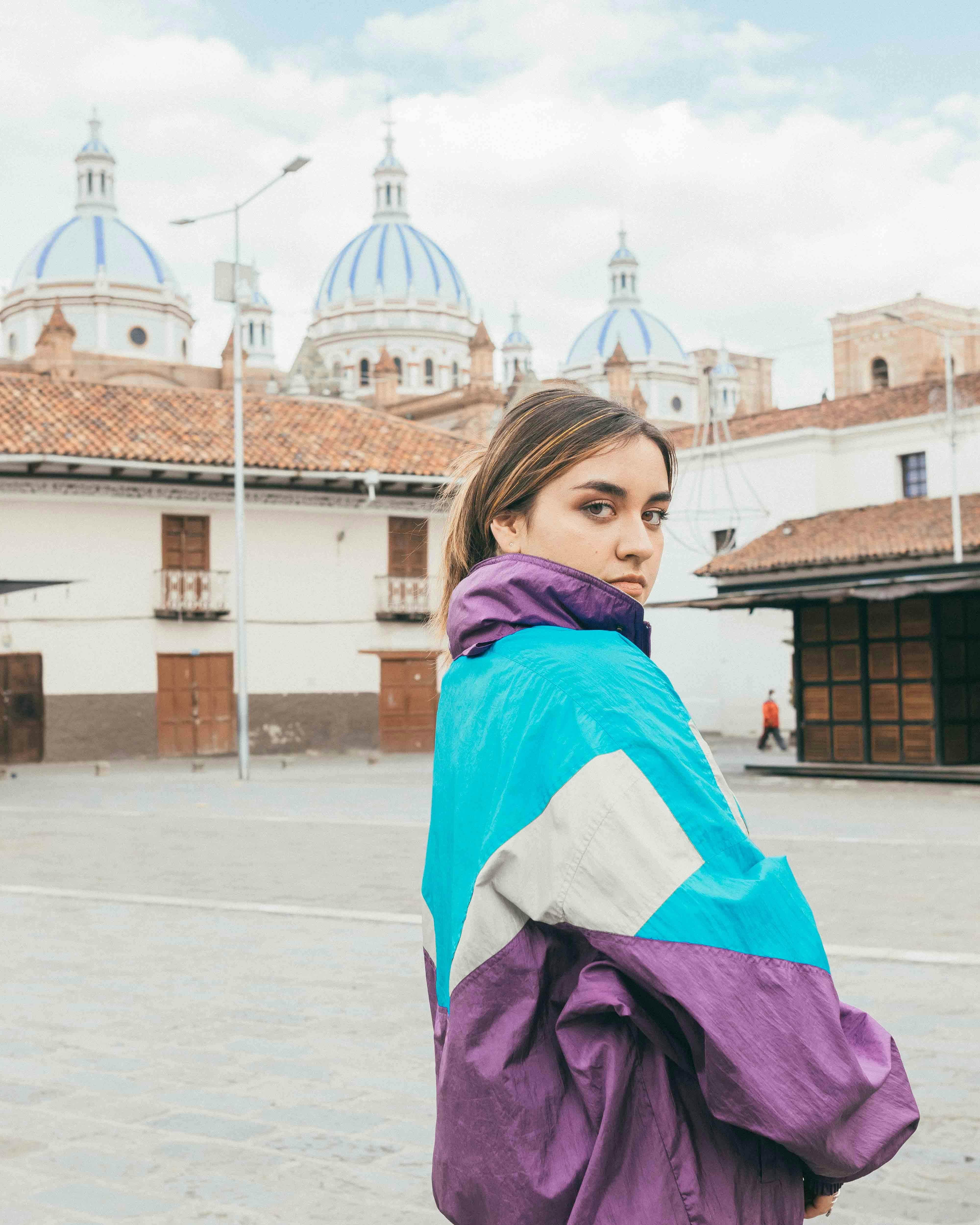Mujer joven posando en una plaza de Cuenca con iglesias coloniales de fondo. Refleja la arquitectura patrimonio de la ciudad, con edificaciones blancas de estilo colonial ecuatoriano.