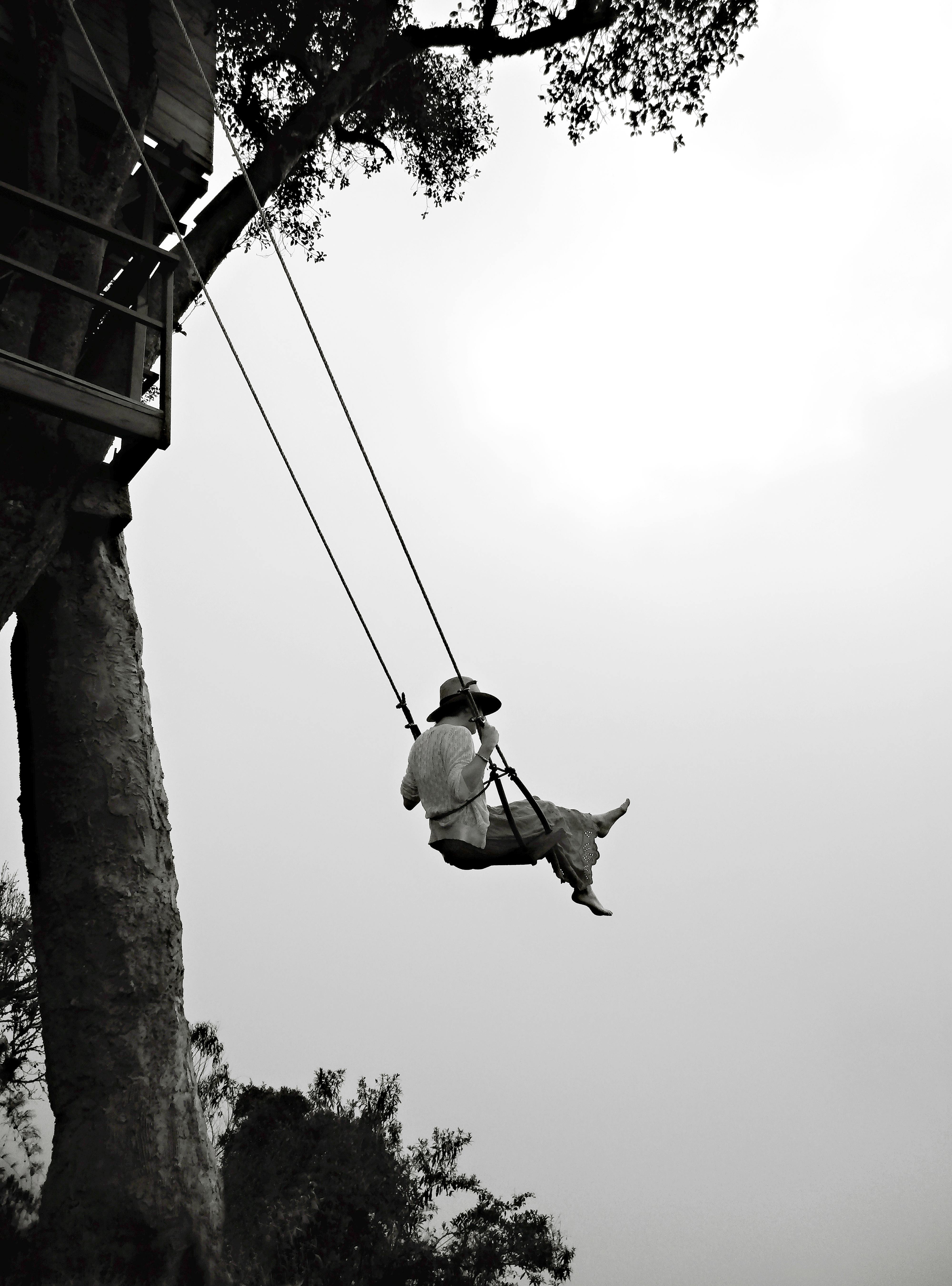 Mujer joven disfrutando de un columpio suspendido sobre las nubes en Baños de Agua Santa, Ecuador. La fotografía captura un momento de aventura y conexión con la naturaleza en uno de los destinos turísticos más populares del país, conocido por sus actividades de ecoturismo y paisajes nubosos.