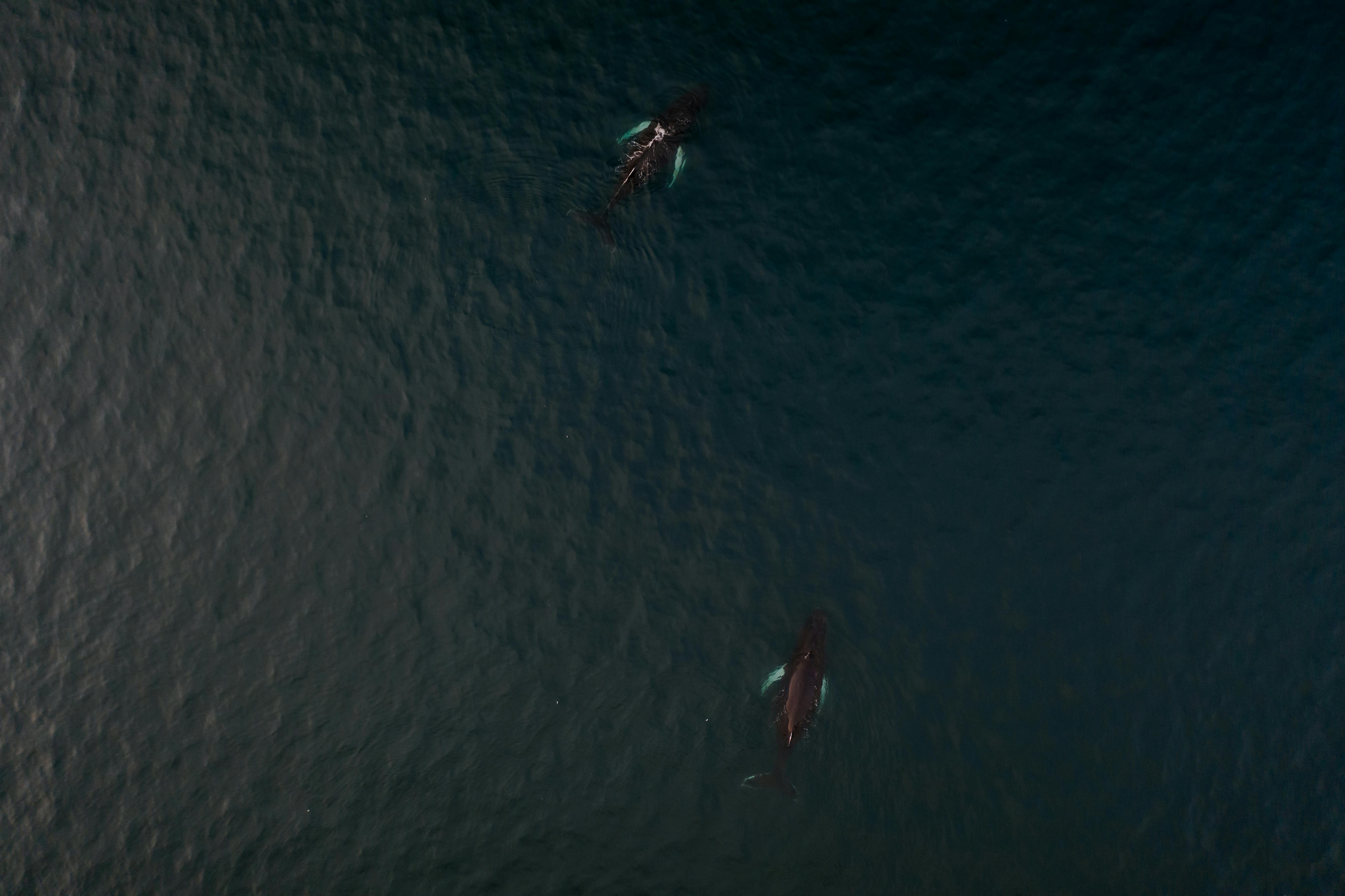 Vista aérea de ballenas jorobadas en el océano. La imagen muestra dos cetáceos en aguas azules, típico de la costa ecuatoriana durante temporada de migración. Fotografía profesional tomada desde el aire.