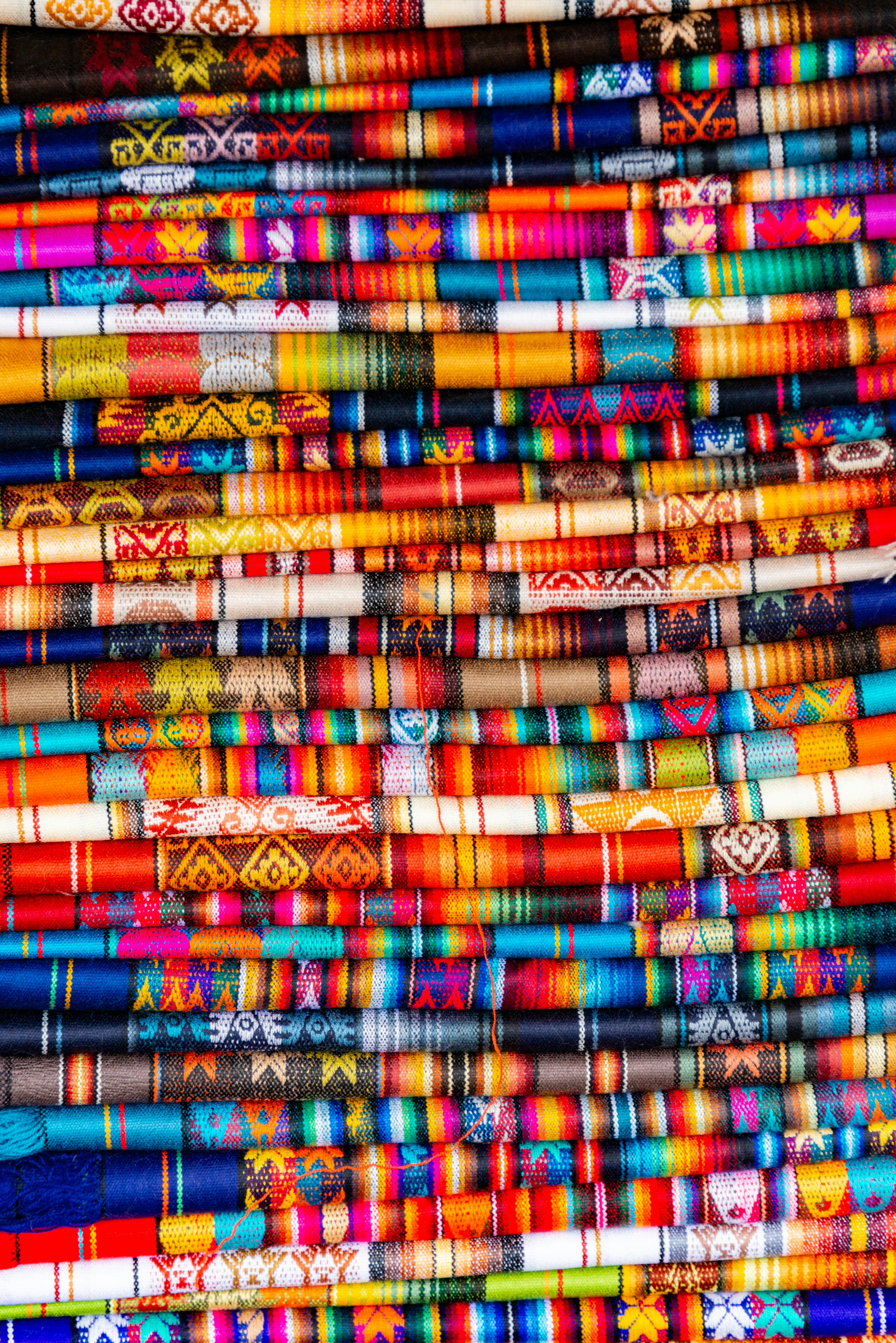 Primer plano de tejidos o textiles artesanales apilados con patrones geométricos y colores vibrantes (rojo, azul, amarillo, naranja). Muestra la riqueza cromática típica de la artesanía textil andina ecuatoriana.