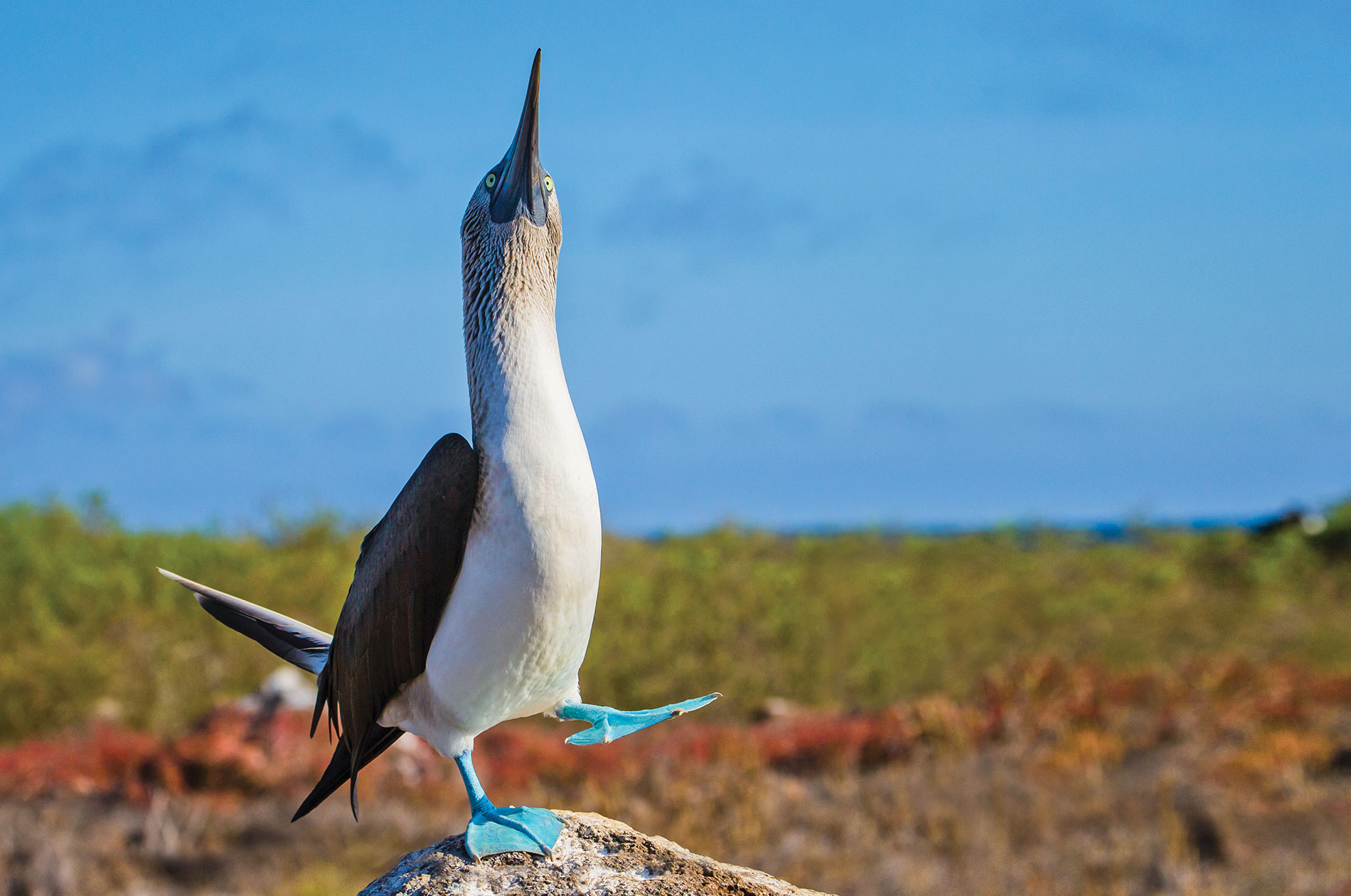 Ave marina endémica de las Islas Galápagos (Ecuador) posada sobre una roca, mostrando su característico plumaje blanco y negro con patas azules brillantes. Fondo de vegetación costera típica del archipiélago.