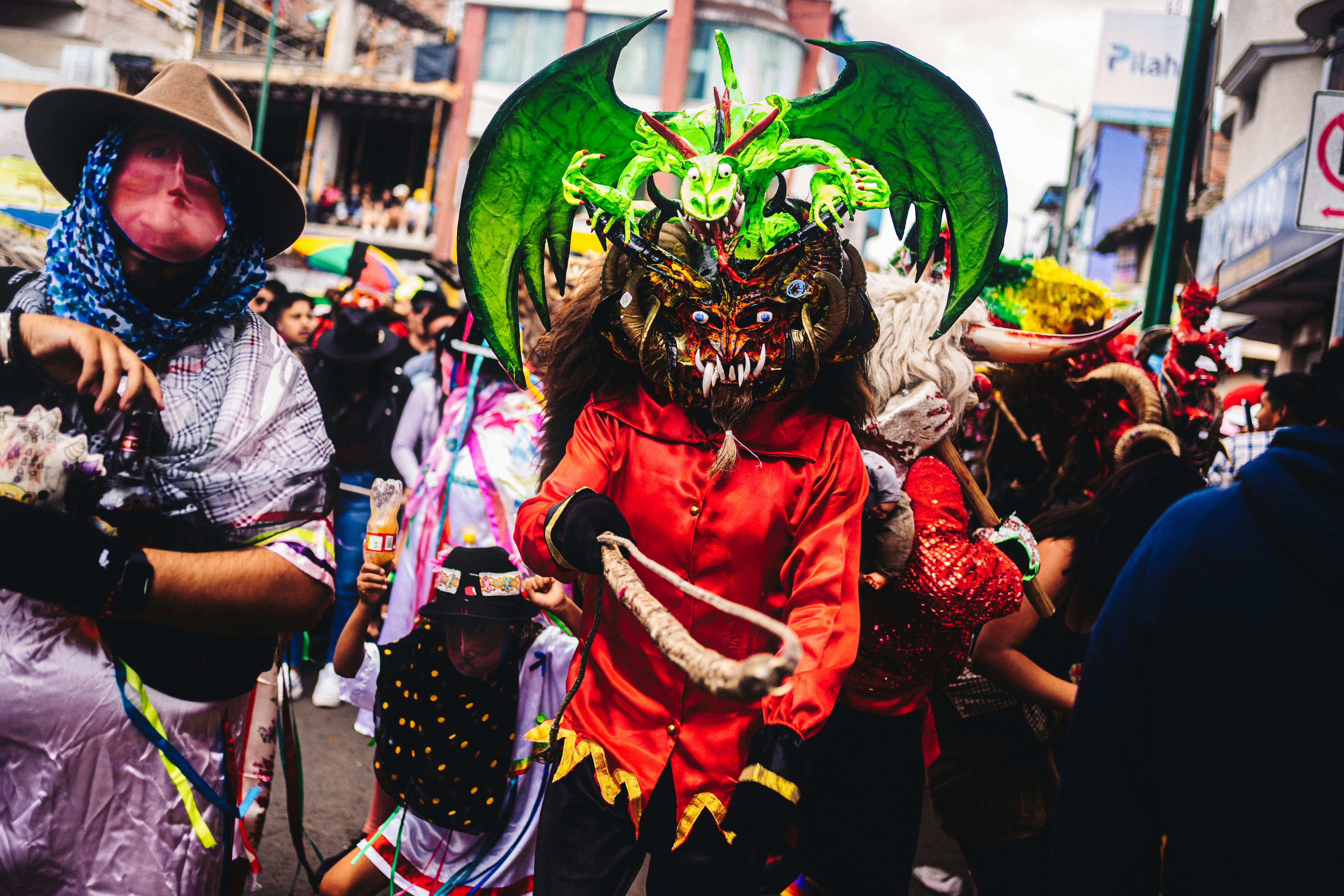 Grupo de personas participando en una festividad tradicional ecuatoriana, vistiendo disfraces elaborados incluyendo máscaras y trajes coloridos de diversos personajes. Captura el ambiente festivo y colorido de una celebración callejera típica de las tradiciones ecuatorianas.
