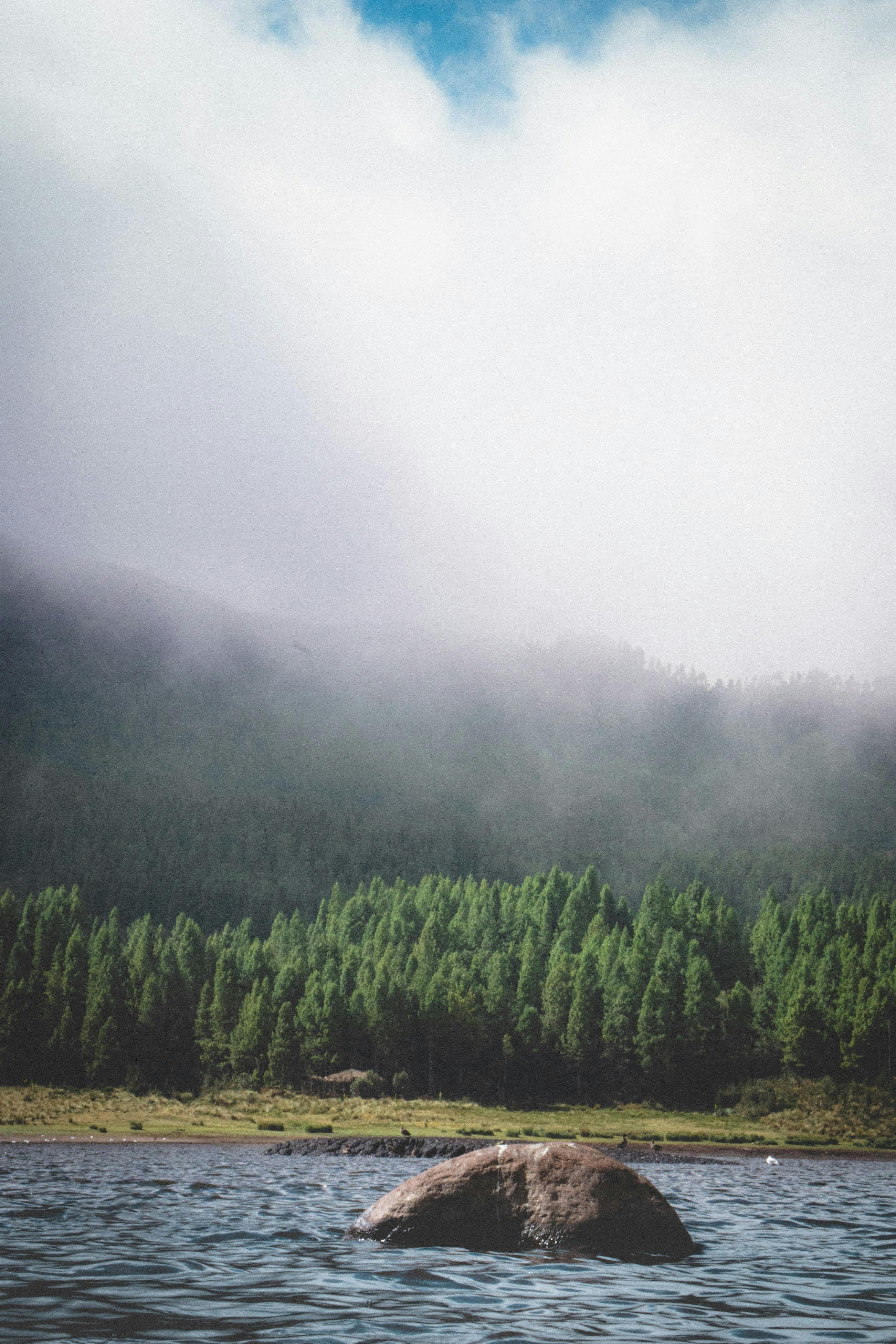 Lago alpino rodeado de bosque nativo verde y denso, con niebla baja cubriendo parcialmente el agua. Atmósfera tranquila y húmeda característica de los ecosistemas de páramo andino ecuatoriano.