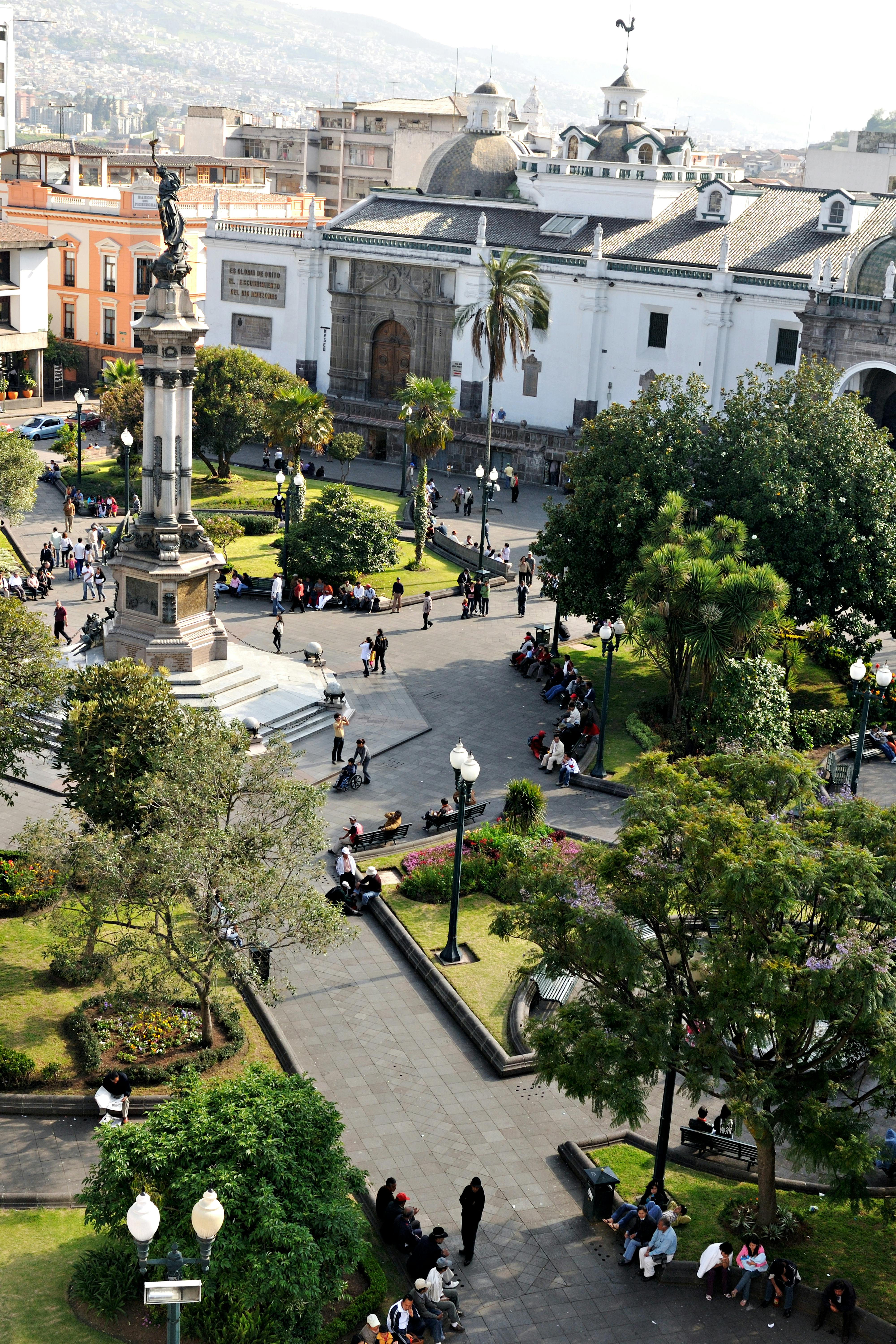 Vista aérea panorámica del centro histórico de Quito mostrando edificaciones coloniales, plazas, iglesias y calles del sector patrimonio de la humanidad. Se aprecia la densidad urbana característica del centro con arquitectura tradicional ecuatoriana.