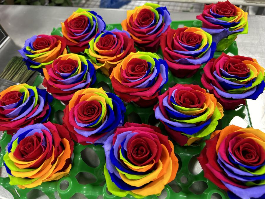 Conjunto de rosas arcoíris (rosas teñidas con pétalos de múltiples colores: rojo, amarillo, azul, morado, verde, naranja) dispuestas en una bandeja. Las flores muestran la variedad y calidad característica de la producción floral ecuatoriana para exportación internacional.