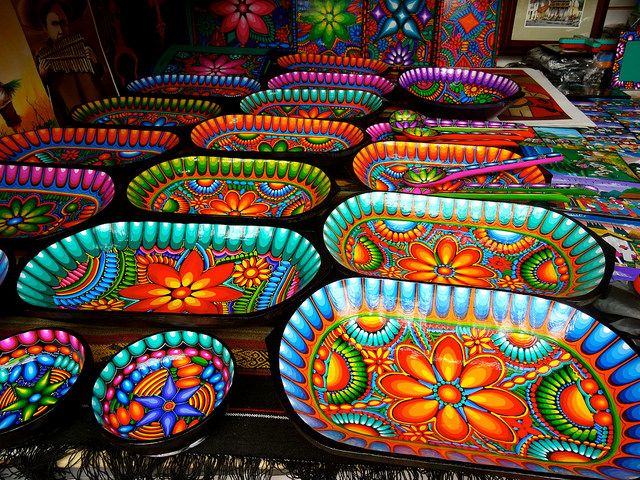Colección de platos y cuencos de cerámica artesanal pintados a mano con diseños florales vibrantes en colores rojo, naranja, azul, verde y turquesa. Representa el patrimonio artesanal ecuatoriano con patrones geométricos y florales típicos de la cerámica tradicional andina.