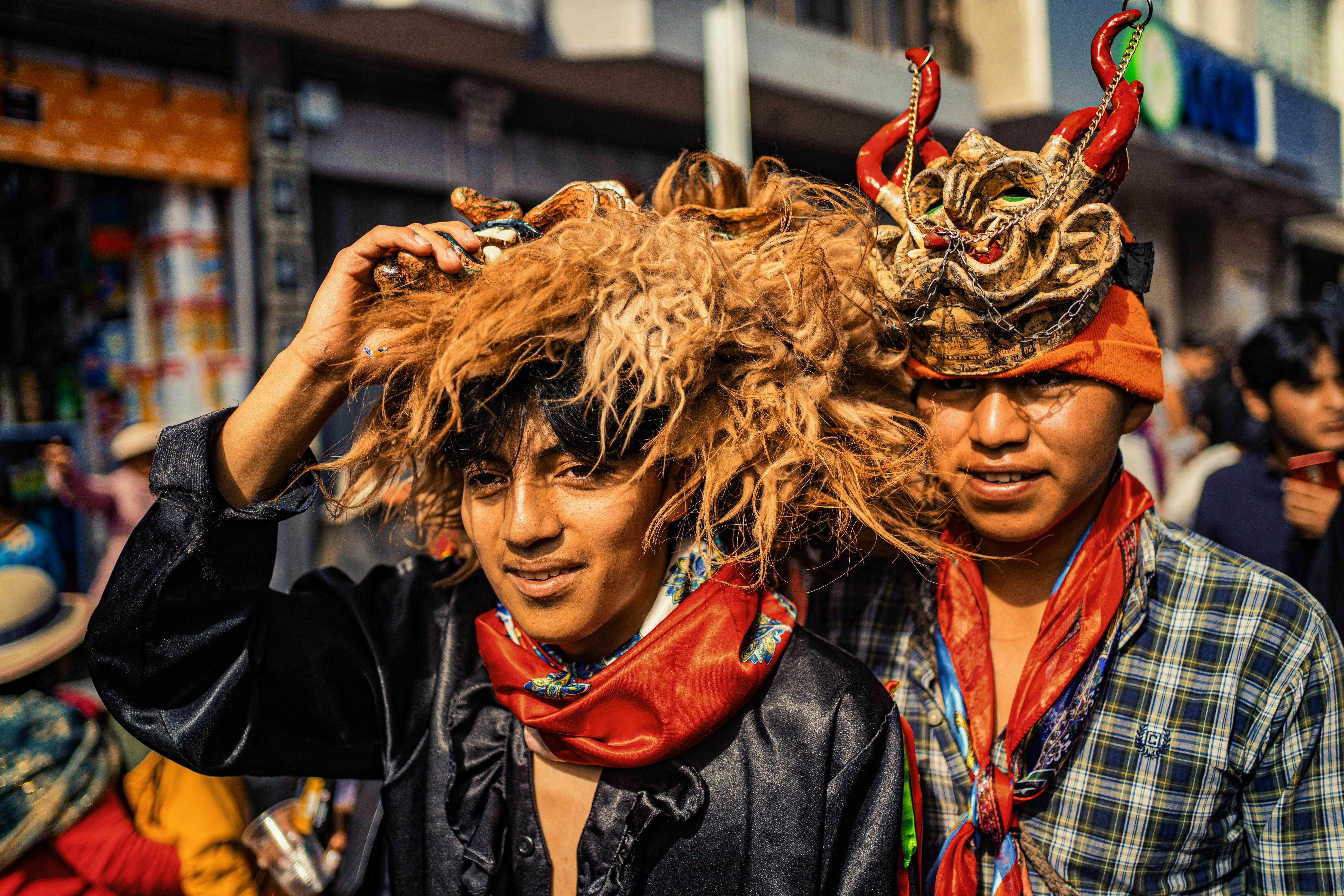 Dos personas en traje tradicional ecuatoriano participando en una celebración festiva callejera. Visten atuendos típicos con elementos coloridos (rojo, naranja) y peinados elaborados característicos de fiestas populares andinas ecuatorianas. La fotografía captura el ambiente festivo y la rica tradición cultural del país.