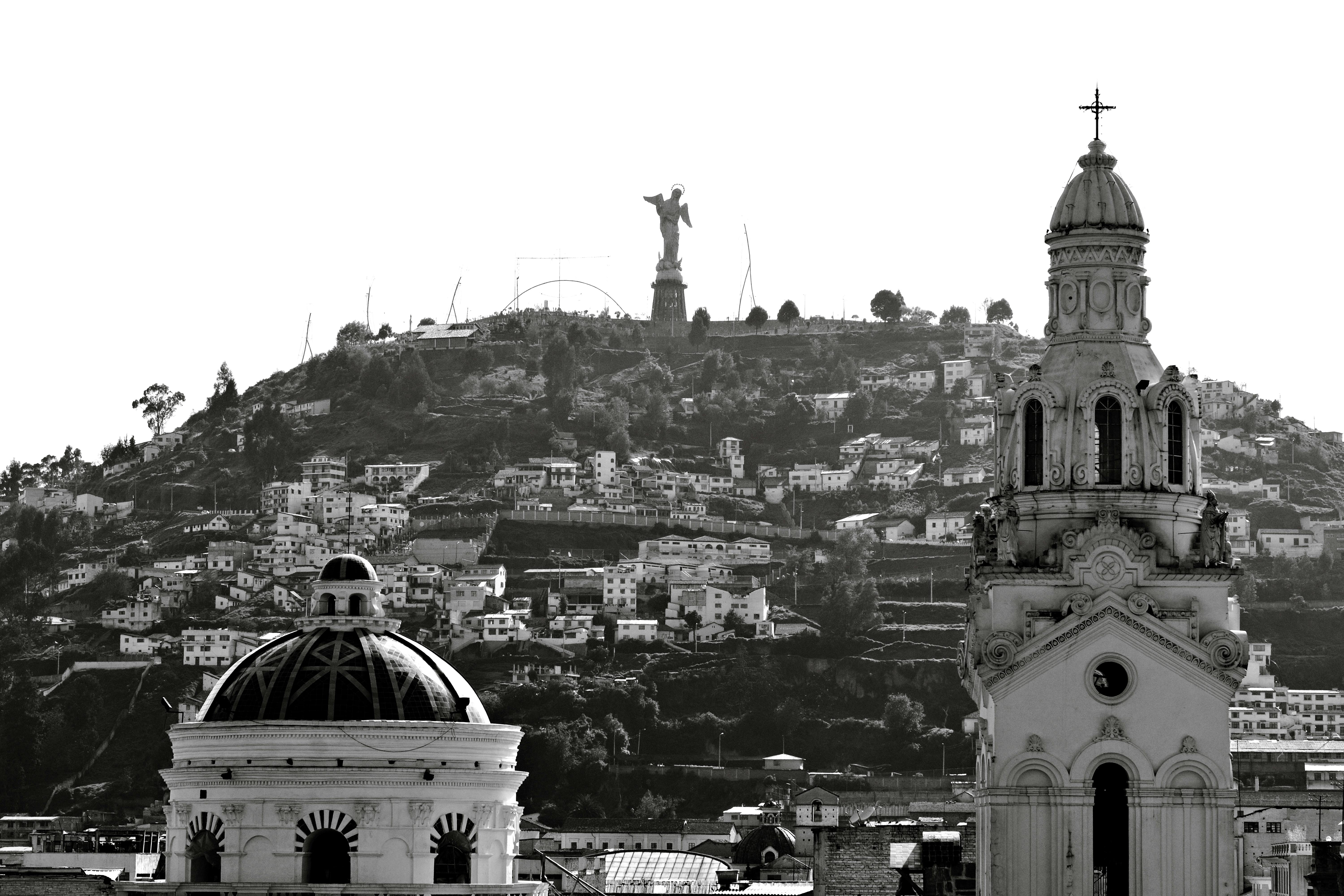 Fotografía en blanco y negro que muestra la vista panorámica de Quito con la basílica y la estatua del Panecillo en la colina. La imagen captura la arquitectura colonial e histórica de la ciudad capital ecuatoriana con excelente composición y contraste.