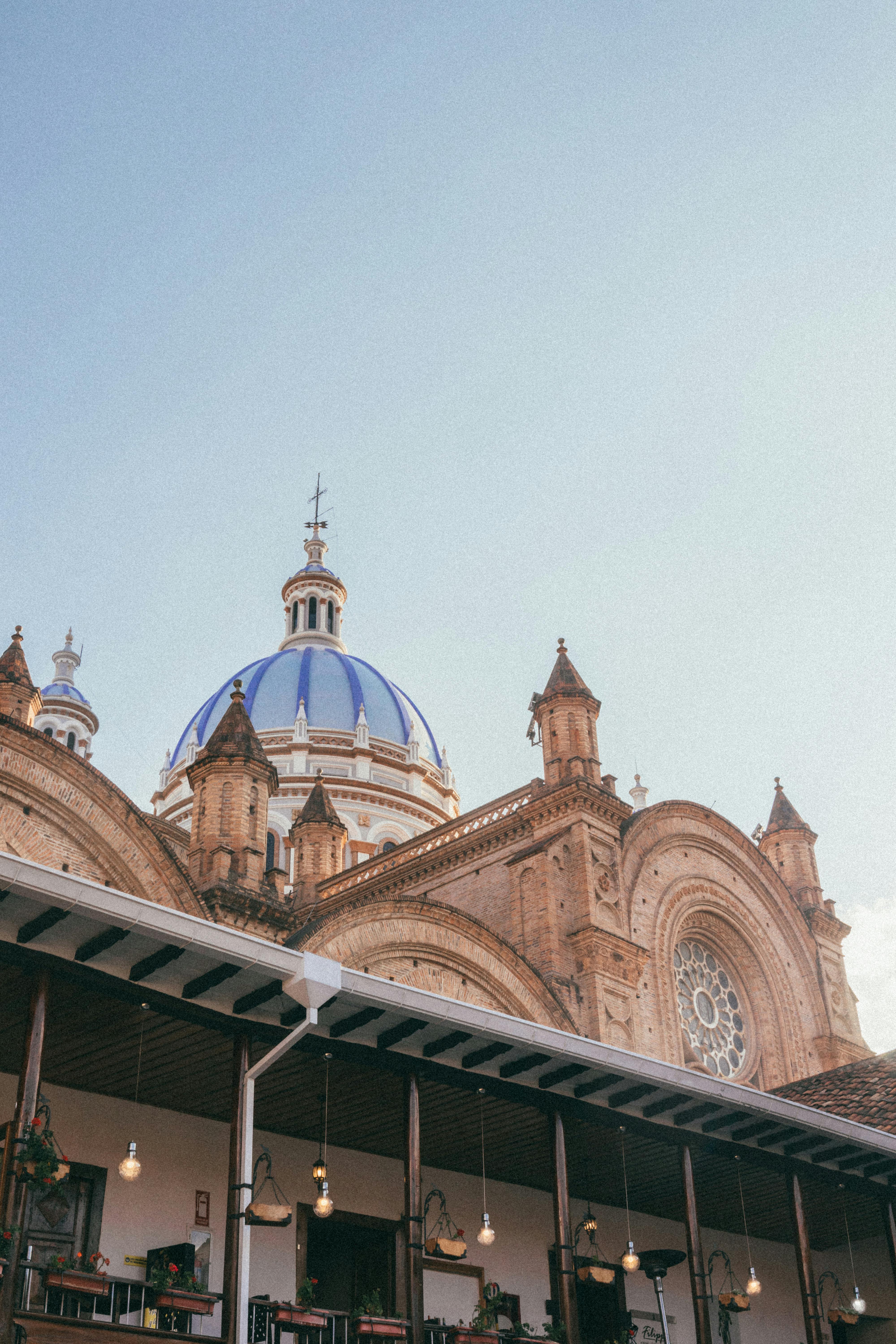 Vista de la cúpula de una iglesia colonial con arquitectura religiosa típica de Cuenca, Ecuador. La imagen captura detalles arquitectónicos coloniales con cielo despejado. Perspectiva desde nivel de calle mostrando la construcción histórica.