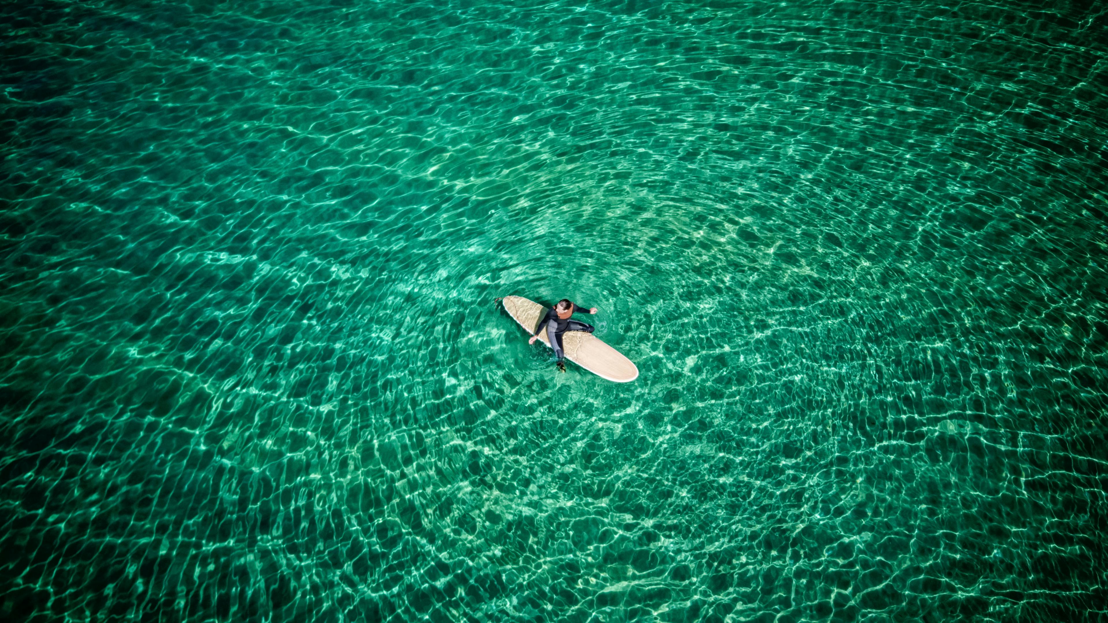 Persona en el agua observando de cerca una ballena jorobada. La imagen aérea muestra el comportamiento natural de la ballena en aguas claras y cristalinas, típicas del litoral ecuatoriano durante temporada de migración.