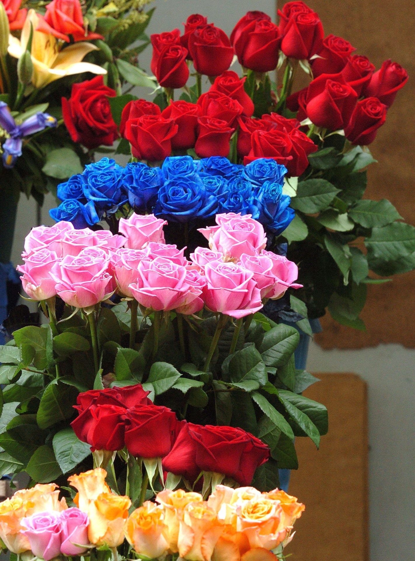 Arreglo floral profesional mostrando rosas de alta calidad en múltiples colores: rojo intenso, azul, rosa pastel, rojo y tonos naranja/melocotón. Las flores tienen pétalos bien definidos y follaje verde visible, típicas de las variedades de exportación ecuatoriana.