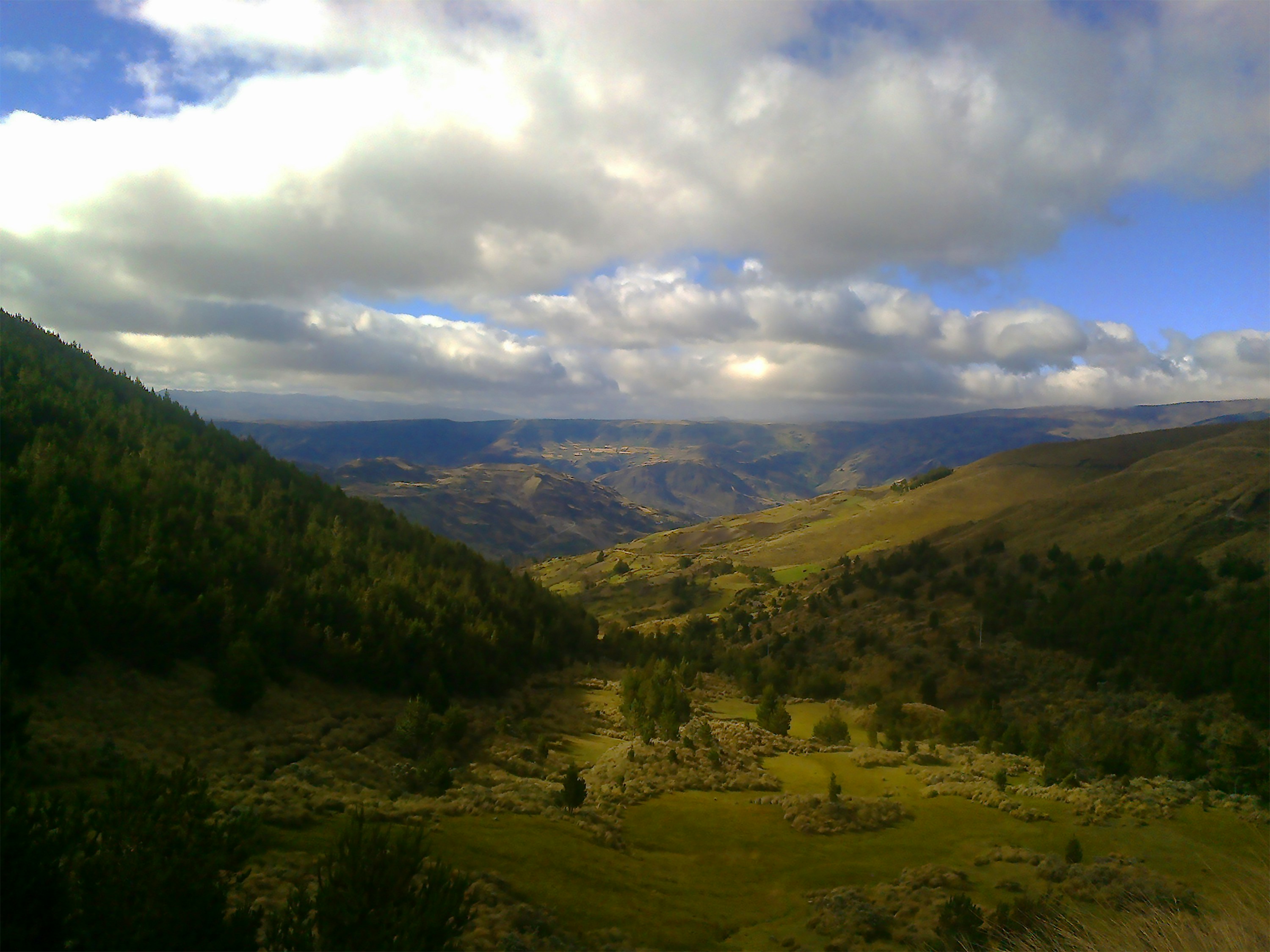 Vista panorámica de un valle montañoso ecuatoriano con bosques de pino, pastizales verdes, nubes blancas y montañas al fondo. Típico paisaje de la región interandina del Ecuador.