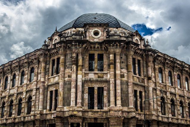 Edificio de arquitectura colonial ecuatoriana con fachada de piedra tallada, grandes ventanales y cúpula característica. La imagen muestra detalles arquitectónicos típicos del centro histórico de Cuenca, con cielo nublado de montaña andina al fondo.