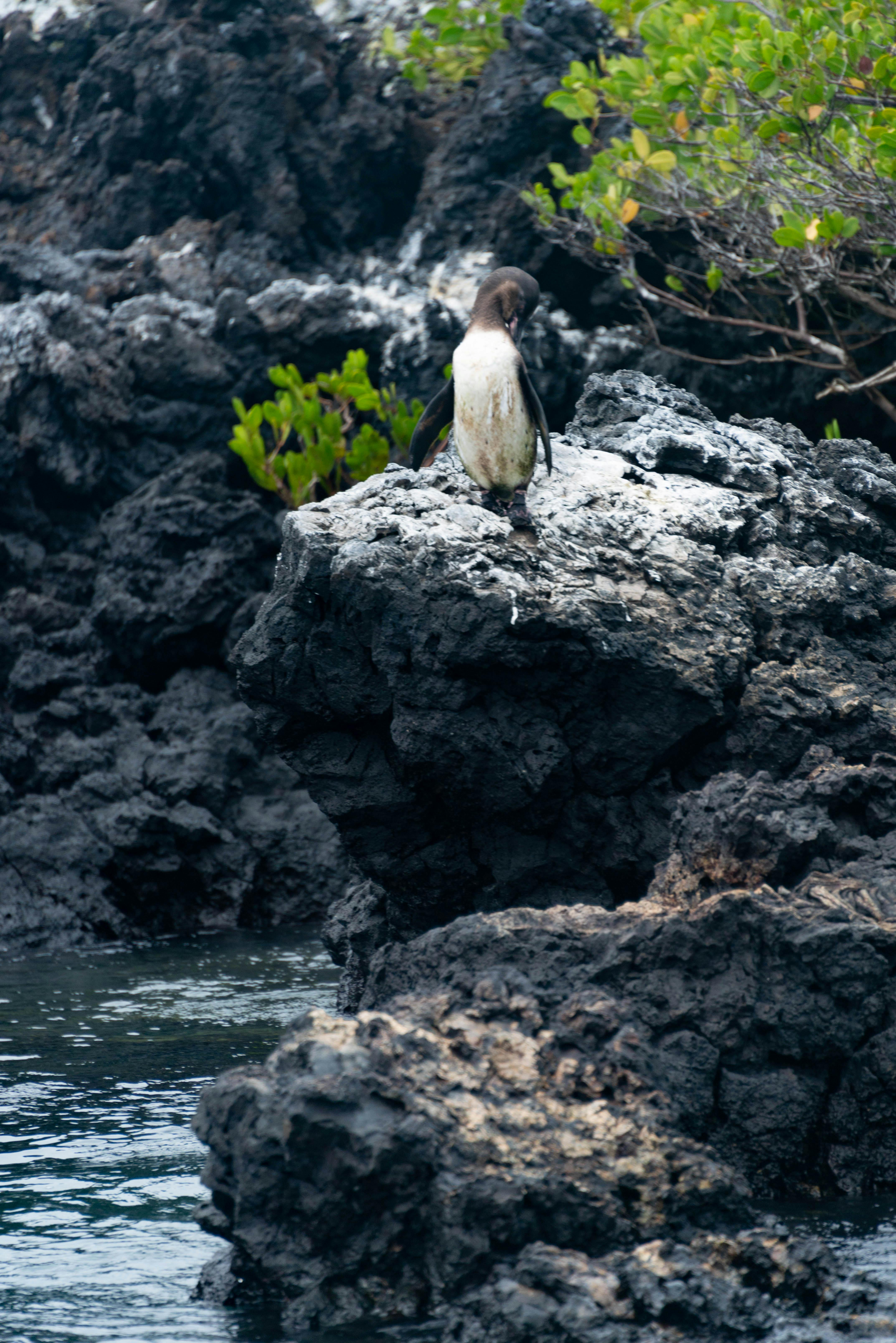 Fotografía de un ave silvestre perchada sobre rocas volcánicas cubiertas de vegetación en el archipiélago de Galápagos, mostrando el hábitat natural y la fauna característica de las islas ecuatorianas.