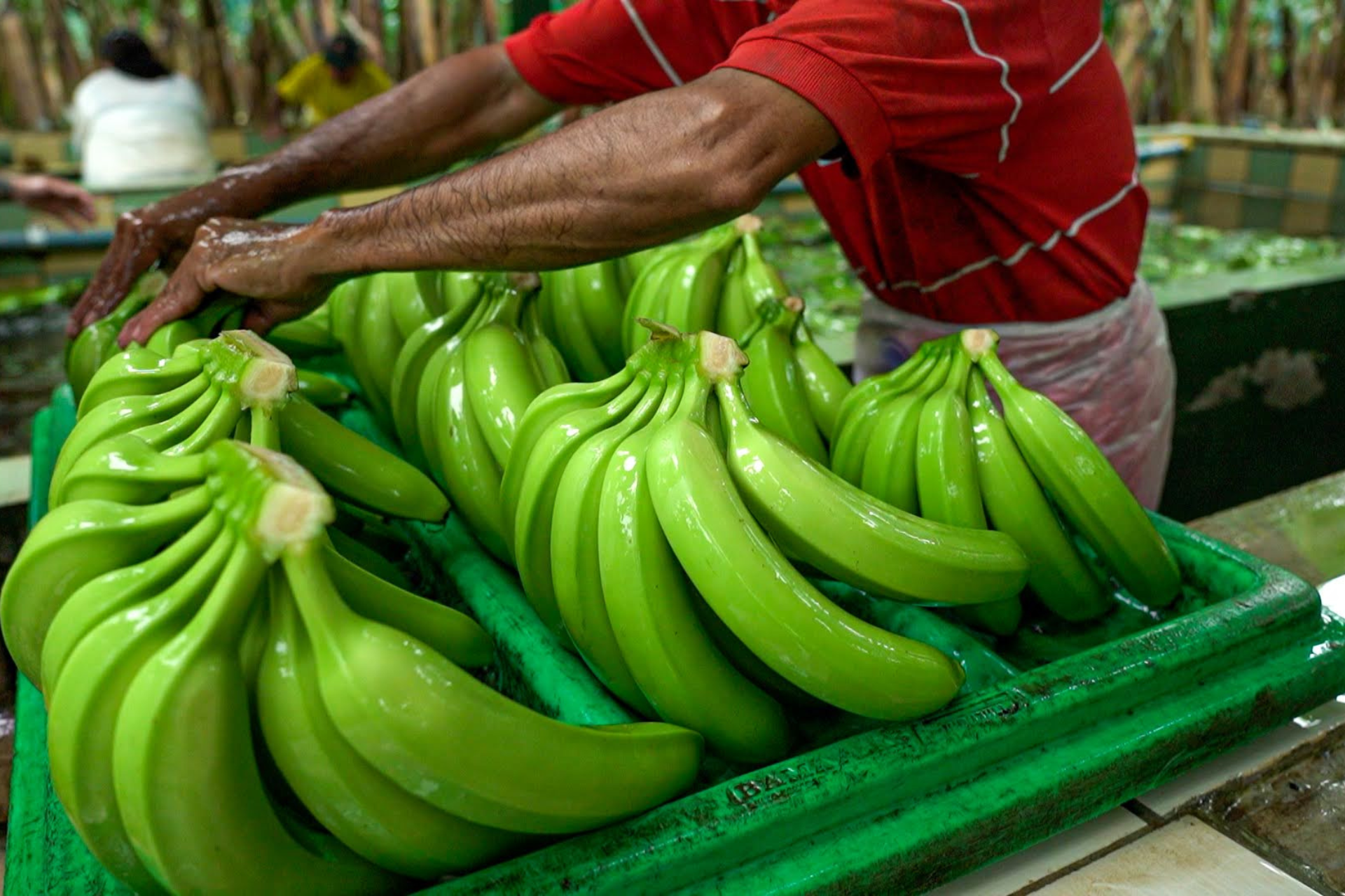 Trabajador en plantación de banano manipulando racimos de bananas verdes frescos en caja de cosecha. Imagen muestra la realidad del cultivo y procesamiento de banano en Ecuador, con manos y brazos del agricultor sosteniendo el producto, racimos verdes con humedad reciente, y cajas de recolección. Al fondo se observan plantas de banano en el cultivo.