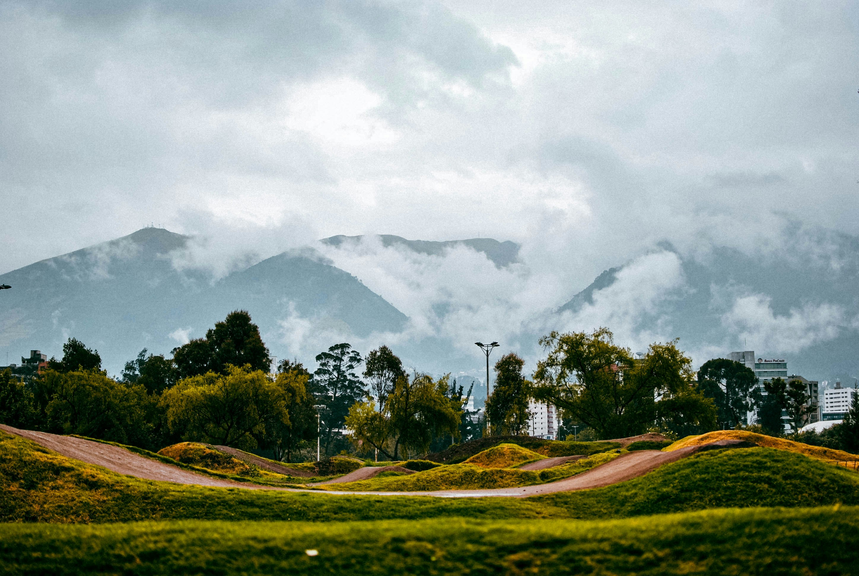 Vista panorámica de cordillera andina con montañas envueltas en nubes, vegetación verde en primer plano y árboles nativos. Cielo nublado típico de las elevaciones ecuatorianas.