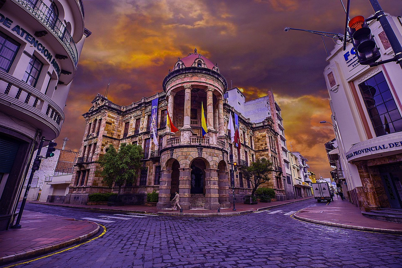 Vista nocturna del centro histórico de Cuenca con edificio colonial de arquitectura neoclásica, banderas nacionales, calles de adoquín y cielo dramático al atardecer. Imagen de alta calidad profesional.